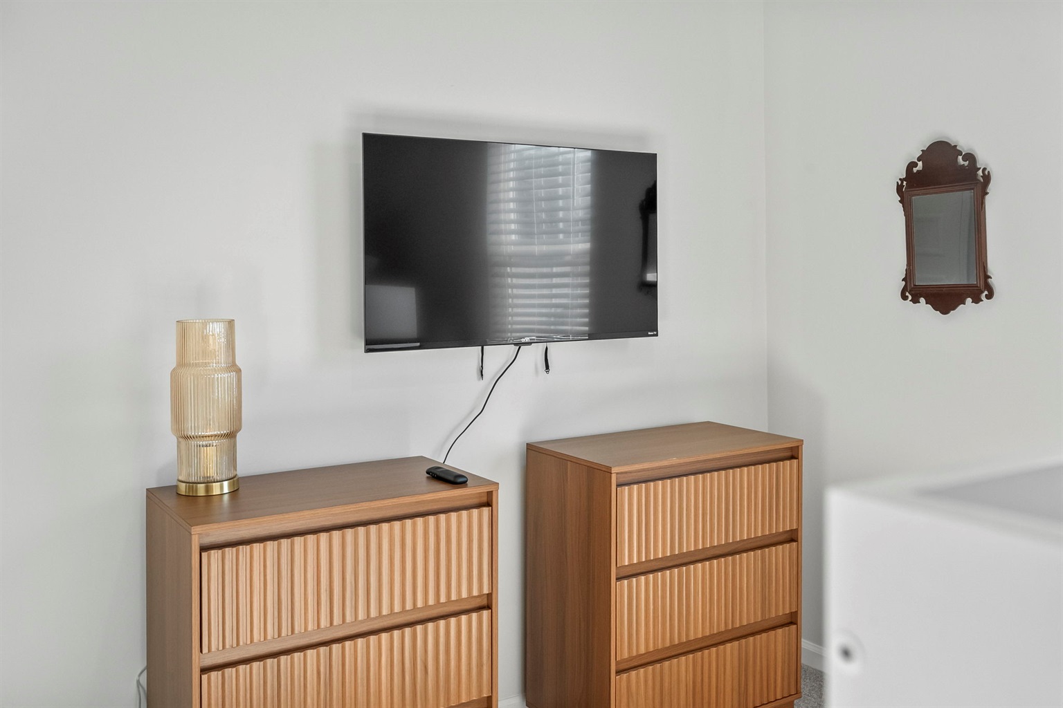 Enjoy morning coffee or family dinners on the charming back patio with a designer outdoor dining set. The fully equipped kitchen, brand-new designer furnishings, and Roku Smart TVs mean you're all set for a relaxing stay. Parking is easy with a 1-car garage and space for 2 more cars in the driveway.