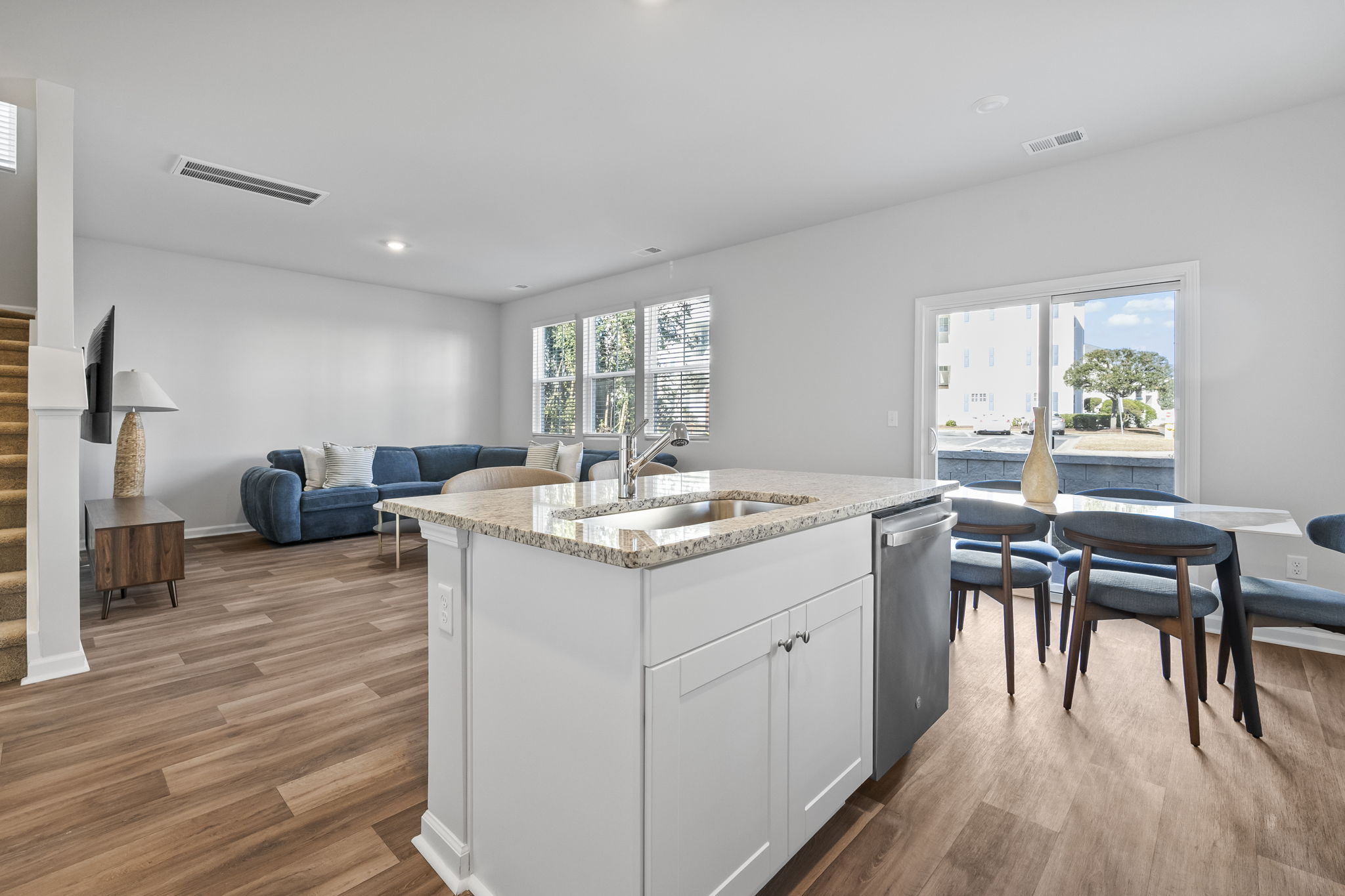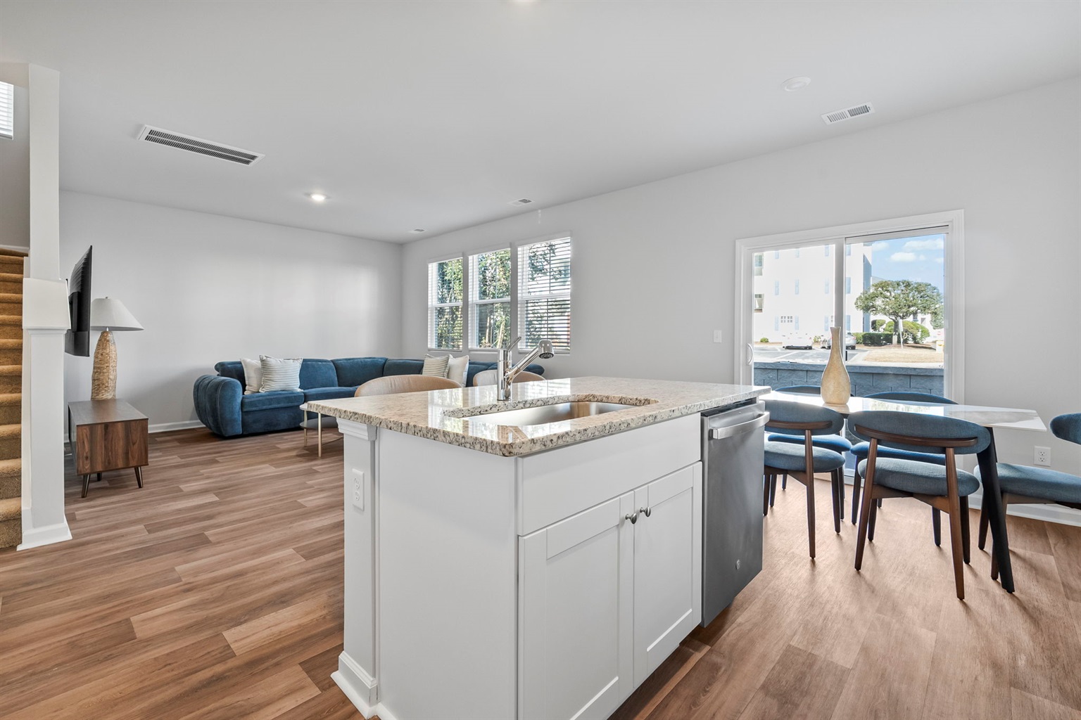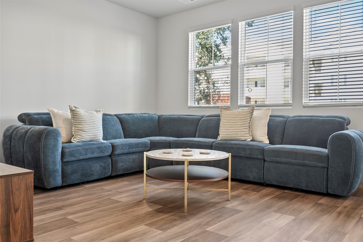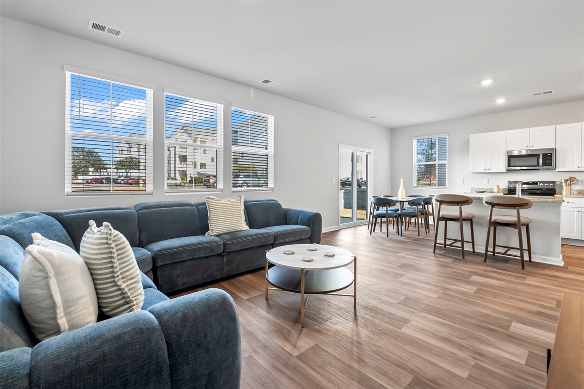 Enjoy morning coffee or family dinners on the charming back patio with a designer outdoor dining set. The fully equipped kitchen, brand-new designer furnishings, and Roku Smart TVs mean you're all set for a relaxing stay. Parking is easy with a 1-car garage and space for 2 more cars in the driveway.